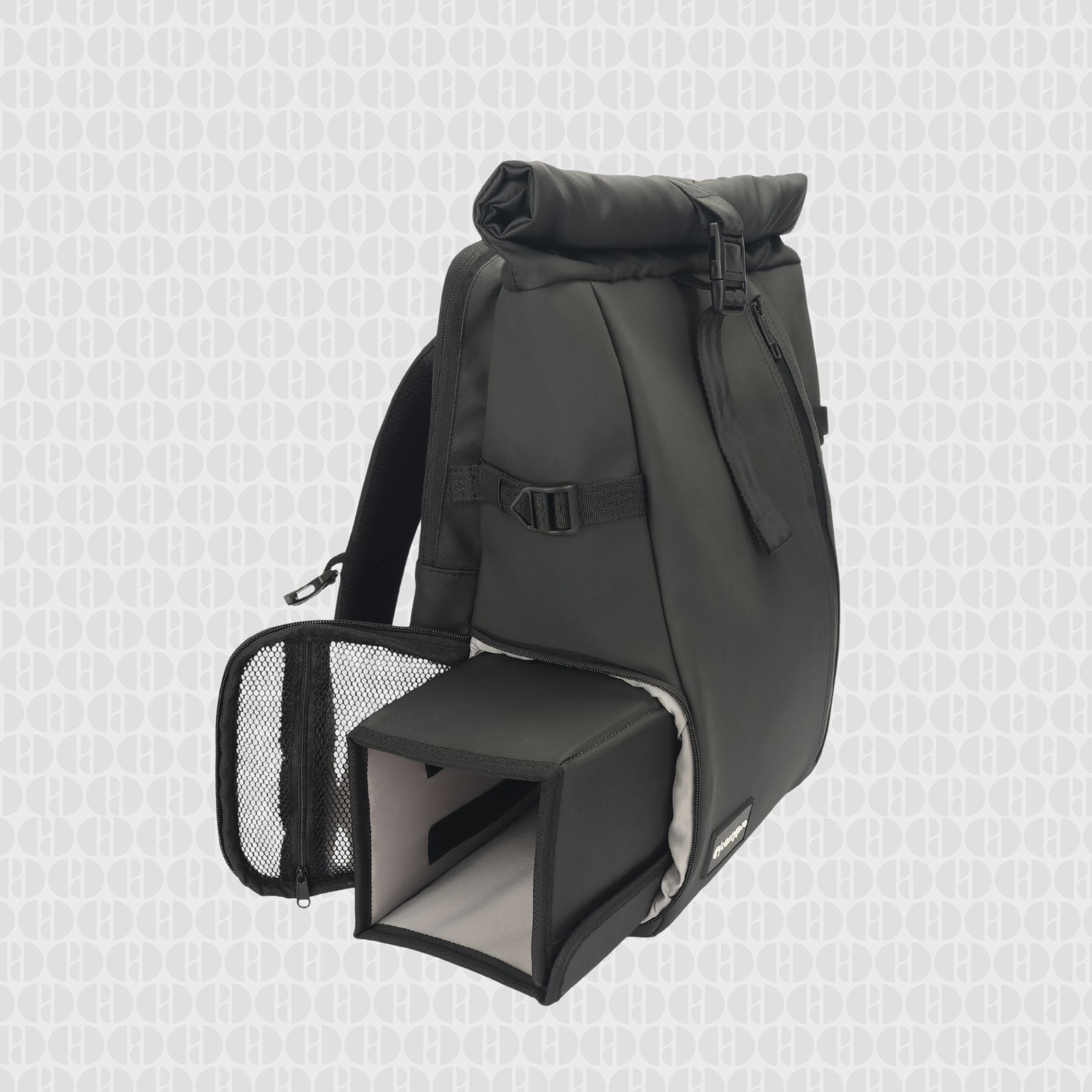 - Roll-top closure with secure buckle lock for adjustable storage and protection.