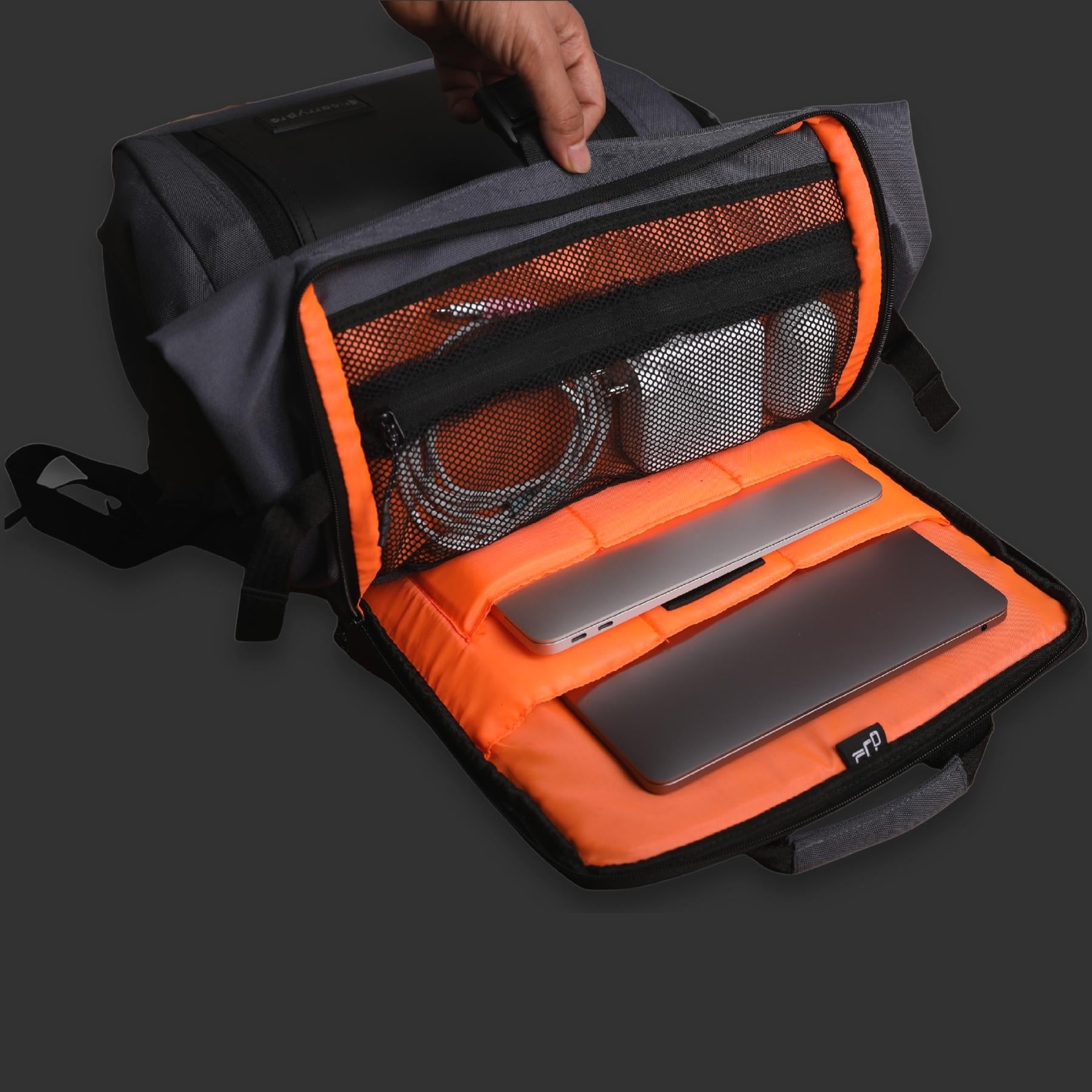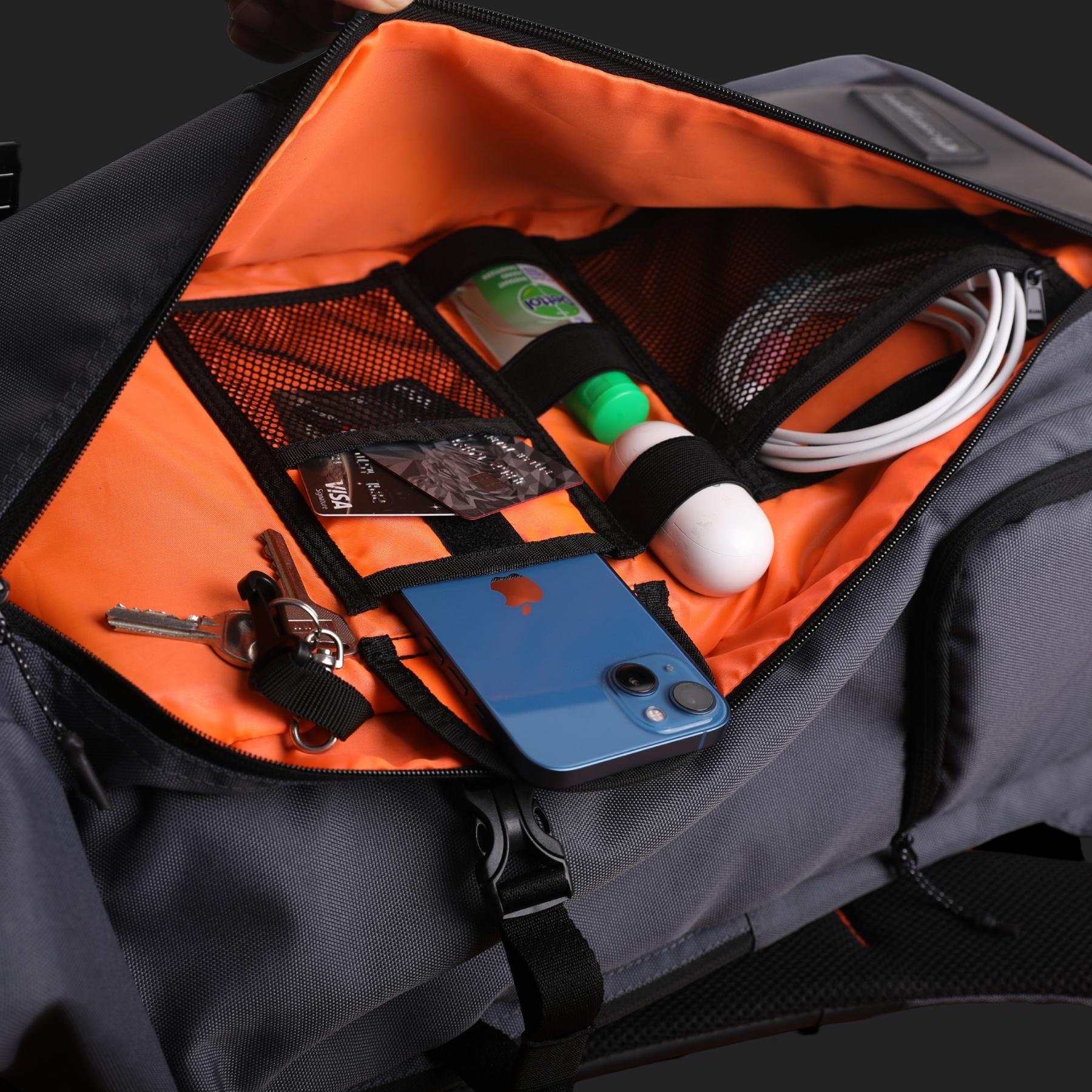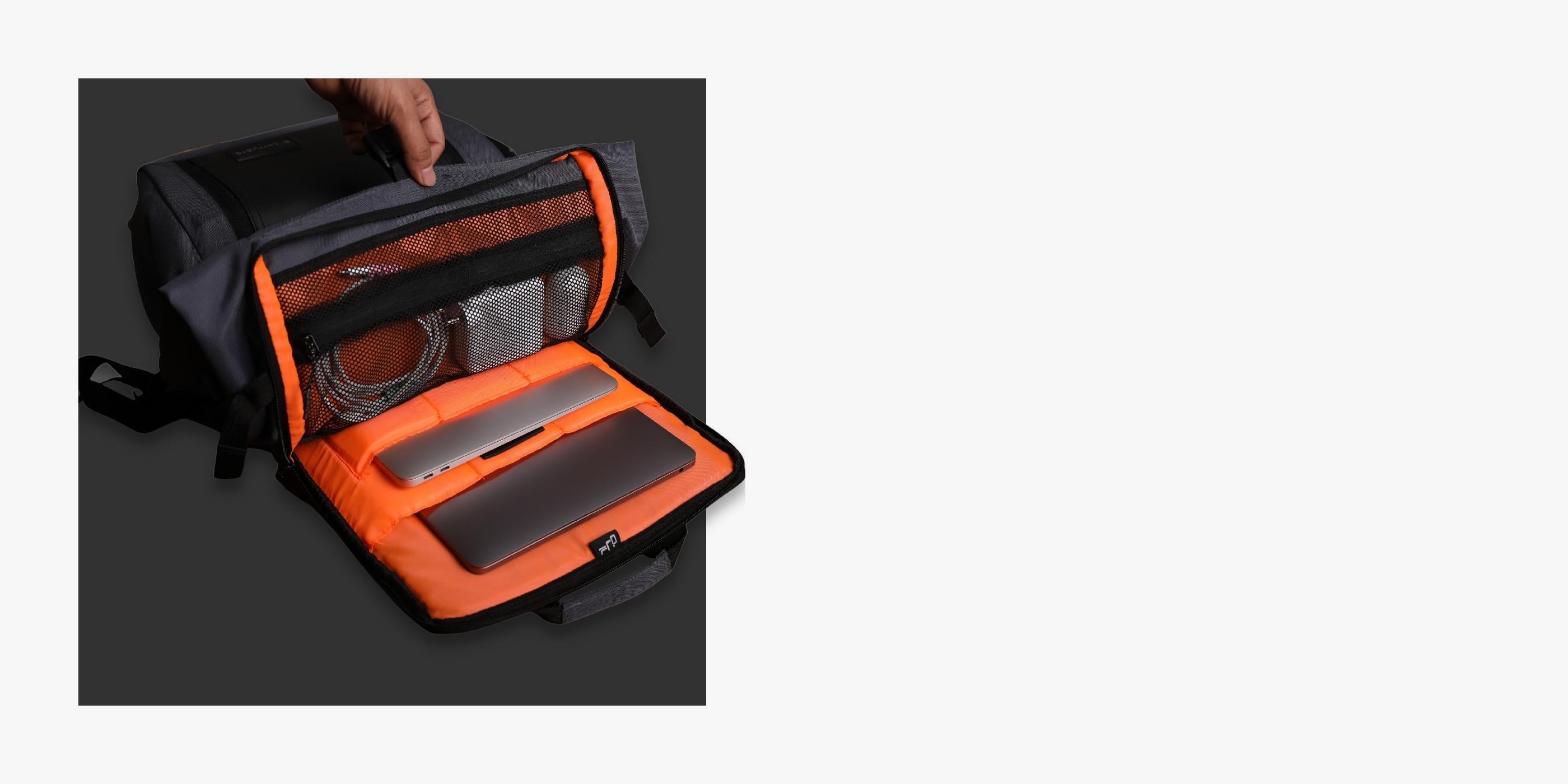 you ORGANIZE chargers, mobile phones, swiss knives, power banks, etc - The Ergonomic Design of the Shoulder Strap & 3D Breathable SPONGE PADDED Cushioning on the backside relieves stress and helps ease off the weight when fully loaded. The WATER-REPELLANT 1000D PU-coated fabric keeps the water away. However, water tends to enter through zippers, so there is a RAIN COVER to protect the bag from wet conditions.