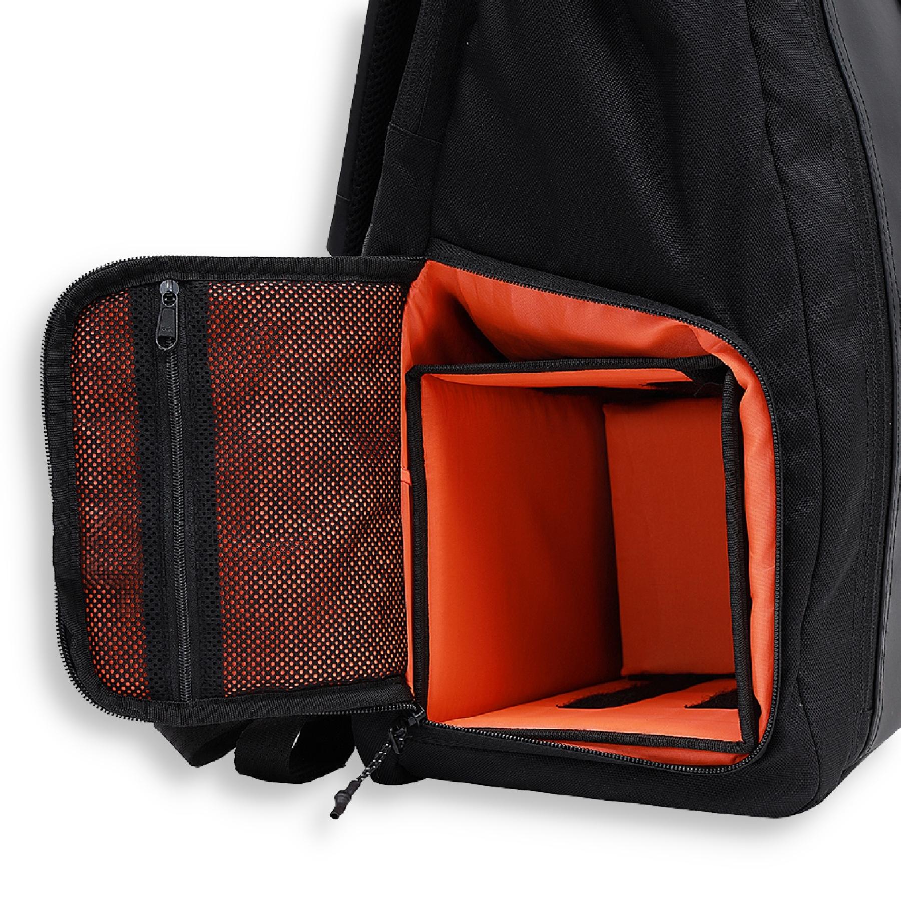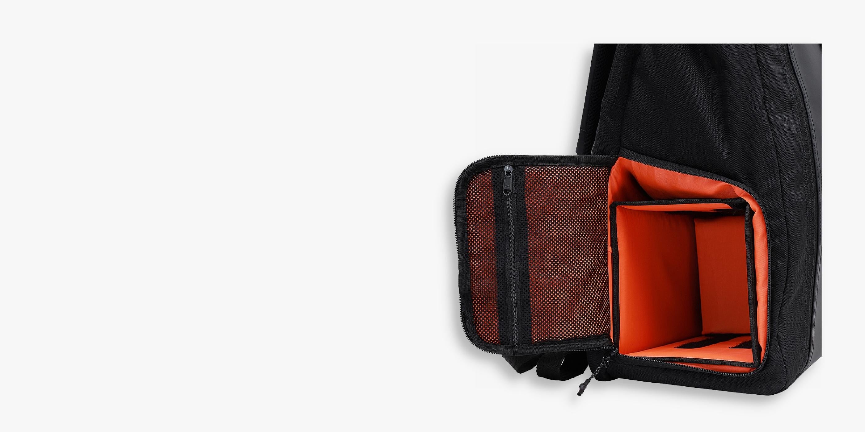 Removable hardshell cube to keep your DSLR. You can also use this as a shoe compartment.