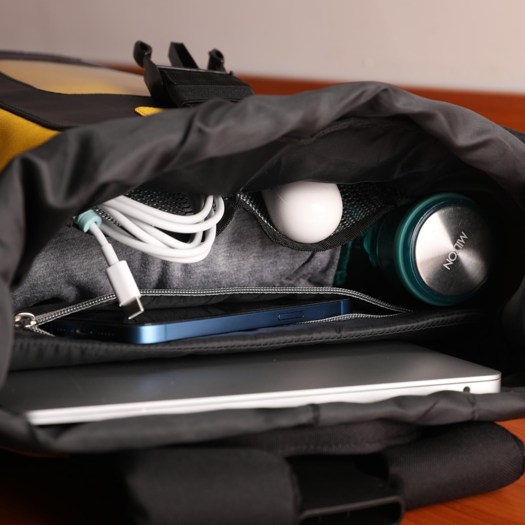 Two net pockets inside to keep cables with a zipper pocket for wallet and a separate water bottle pocket