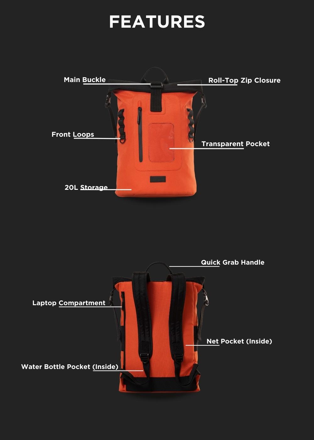 - Roll-top zip closure at the top.