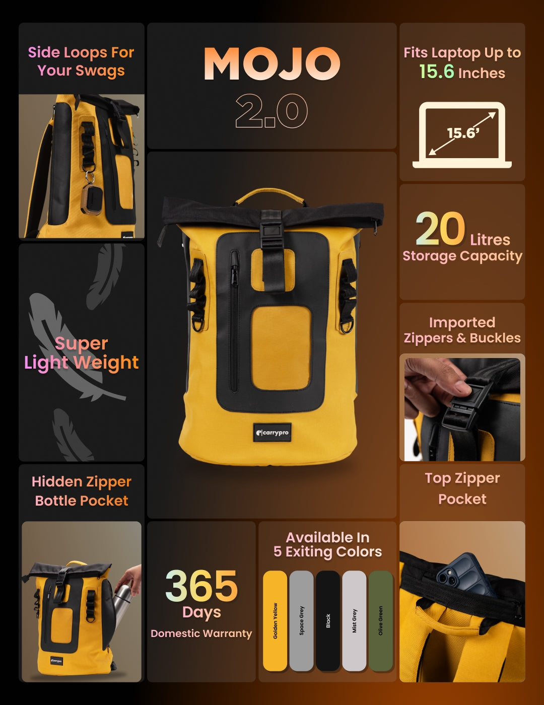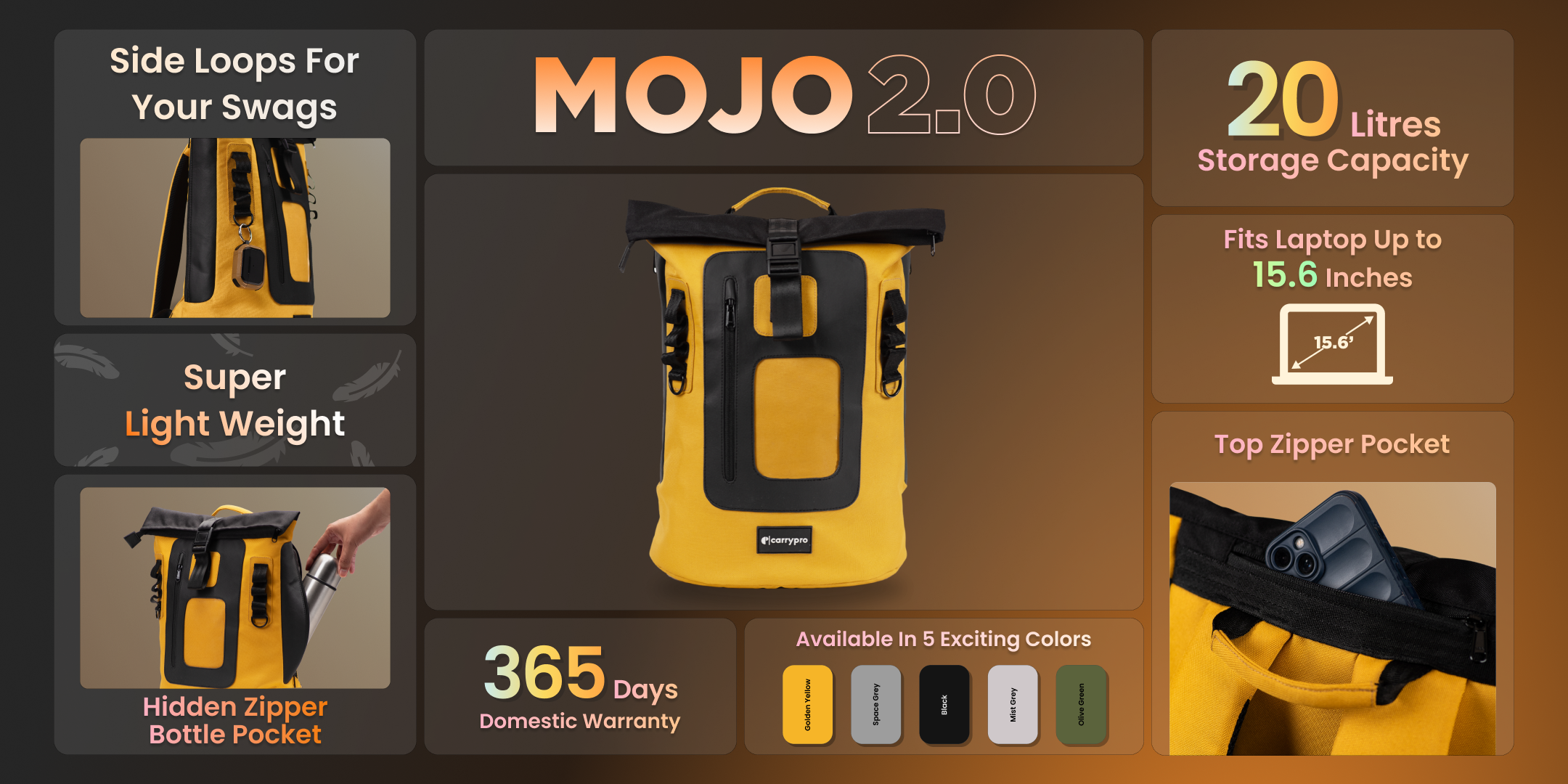 Introducing MOJO V2.0, your favourite all-arounder backpack/bag, now more functional and durable. The backpack comes with two hidden water bottle/utility pockets to carry more while commuting. There is a secret zipper at the top to protect your valuables from theft and mishaps. Fits laptop up-to 15.6 inches so you can Move Like A PRO.