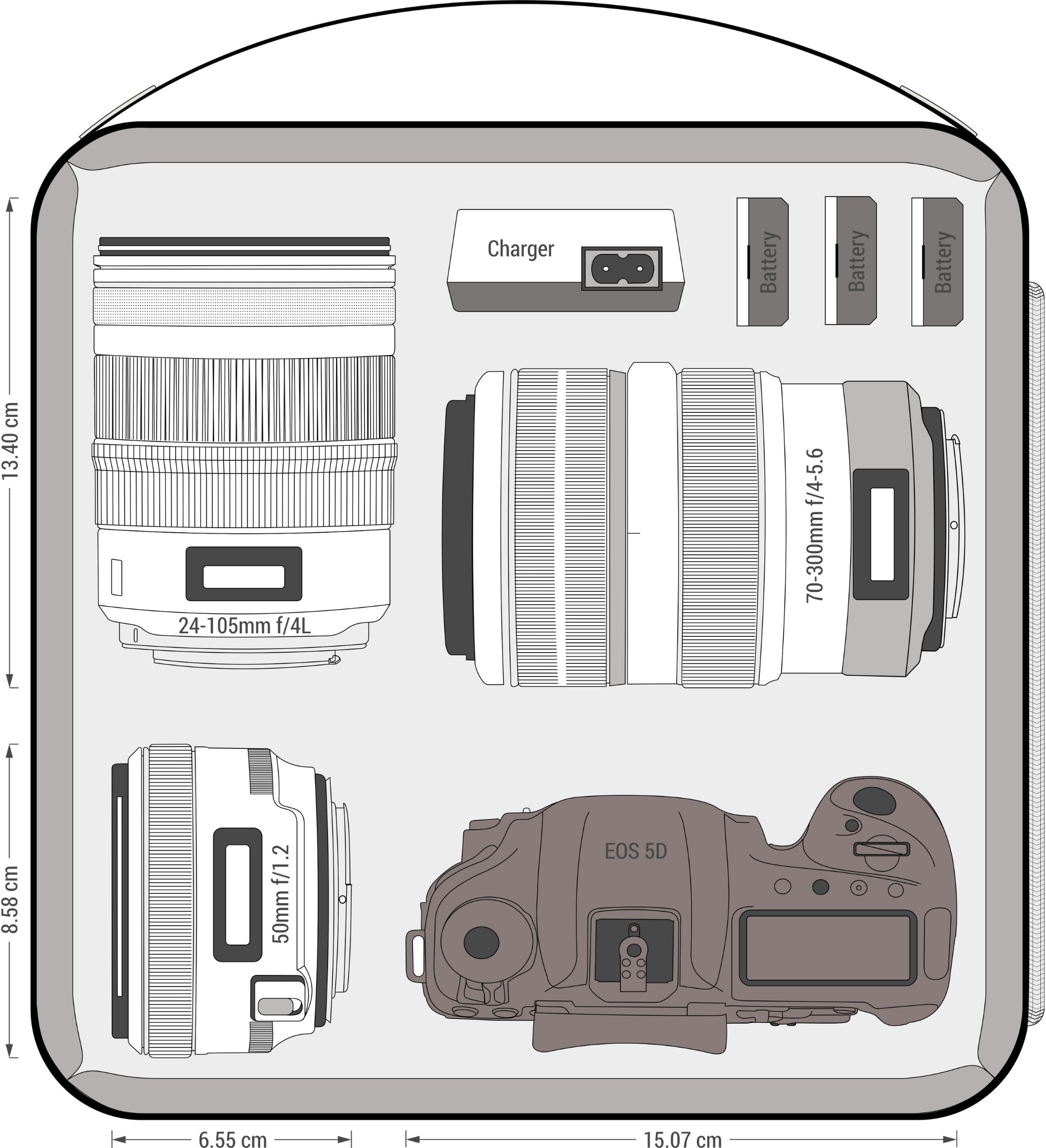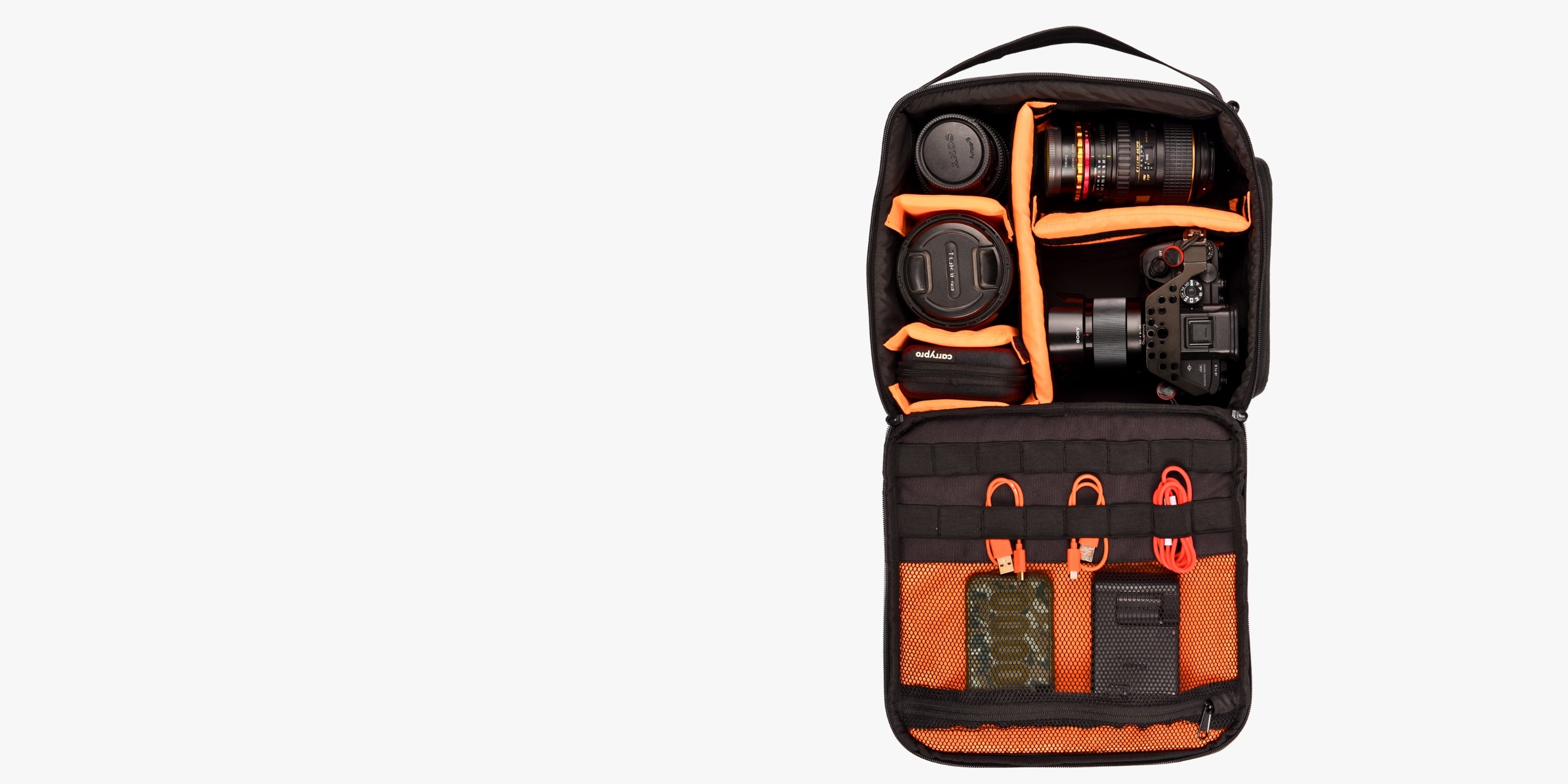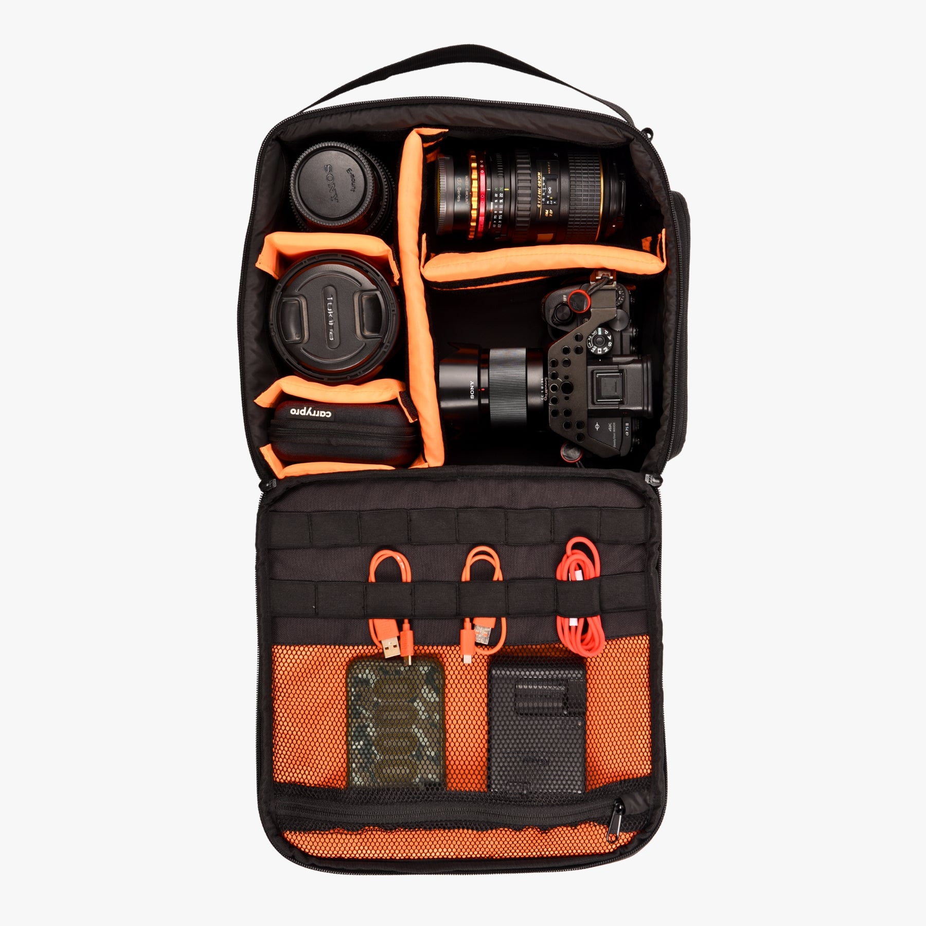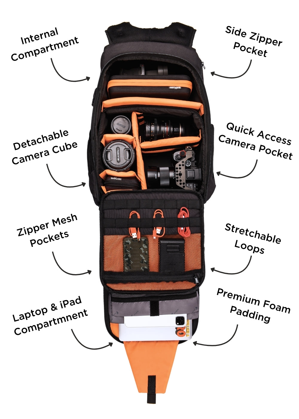 - Detachable Camera Cube with removable sling belt and 5 padded dividers.